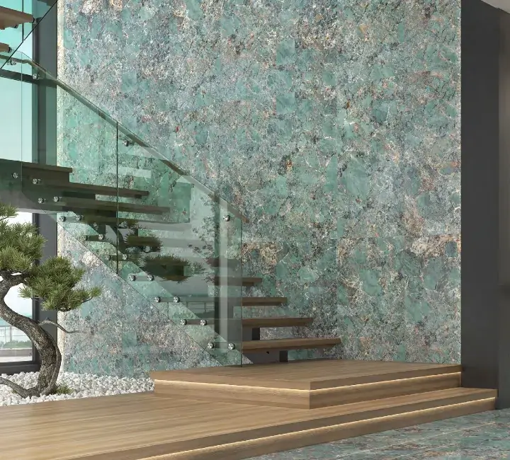 Carrelage Amazonite Turquoise 60×120 apporte un effet marbre bleu-vert luxueux aux murs intérieurs. Sa finition Full Lappato offre brillance et élégance, idéale pour créer des espaces sophistiqués et modernes avec un entretien facile.
