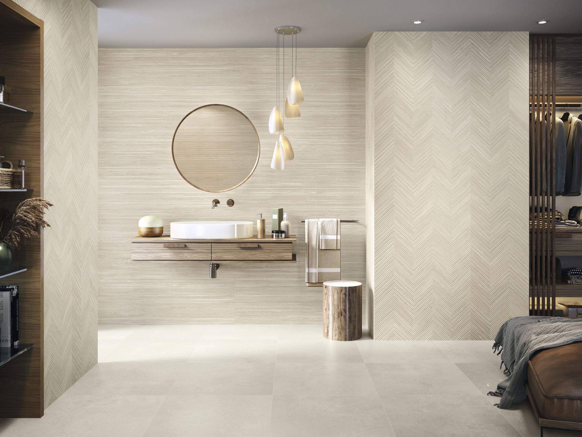 Carrelage Larchwood Zig Maple 40×120 combine bois clair et relief géométrique pour un mur accent raffiné. Ce revêtement en pâte blanche rectifiée résiste à l’eau et convient parfaitement aux intérieurs contemporains.