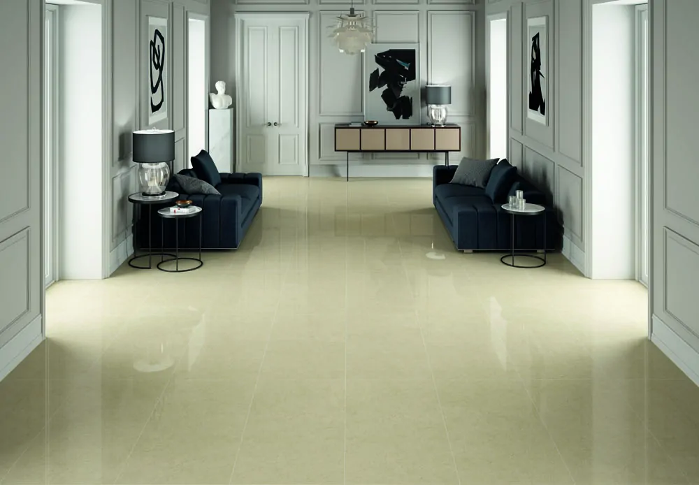 Carrelage Monovar Crema 60×60 et 60×120 en grès cérame brillant ou mat, effet marbre crème ivoire. Adapté au sol et mur, il est anti-tache, résistant à l’eau et offre un rendu élégant et durable. Finition brillante pour plus de lumière, finition mate pour un style naturel et antidérapant.