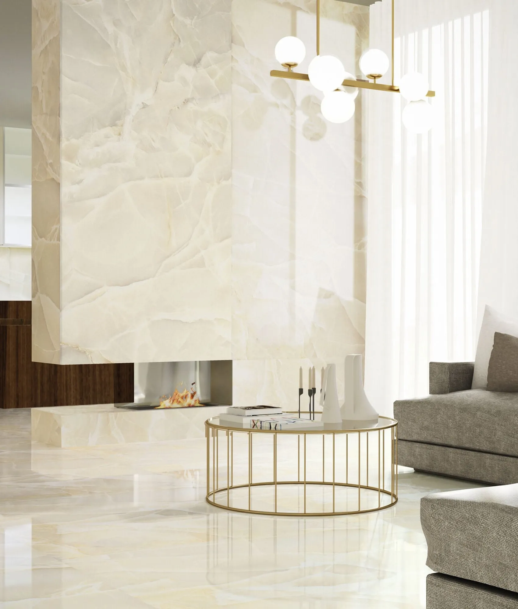 Carrelage Onyx Sable Pulido 60×120 combine un effet marbre onyx brillant avec une teinte sable lumineuse. En grès cérame rectifié, il offre un rendu élégant et naturel, idéal pour les sols et murs intérieurs.